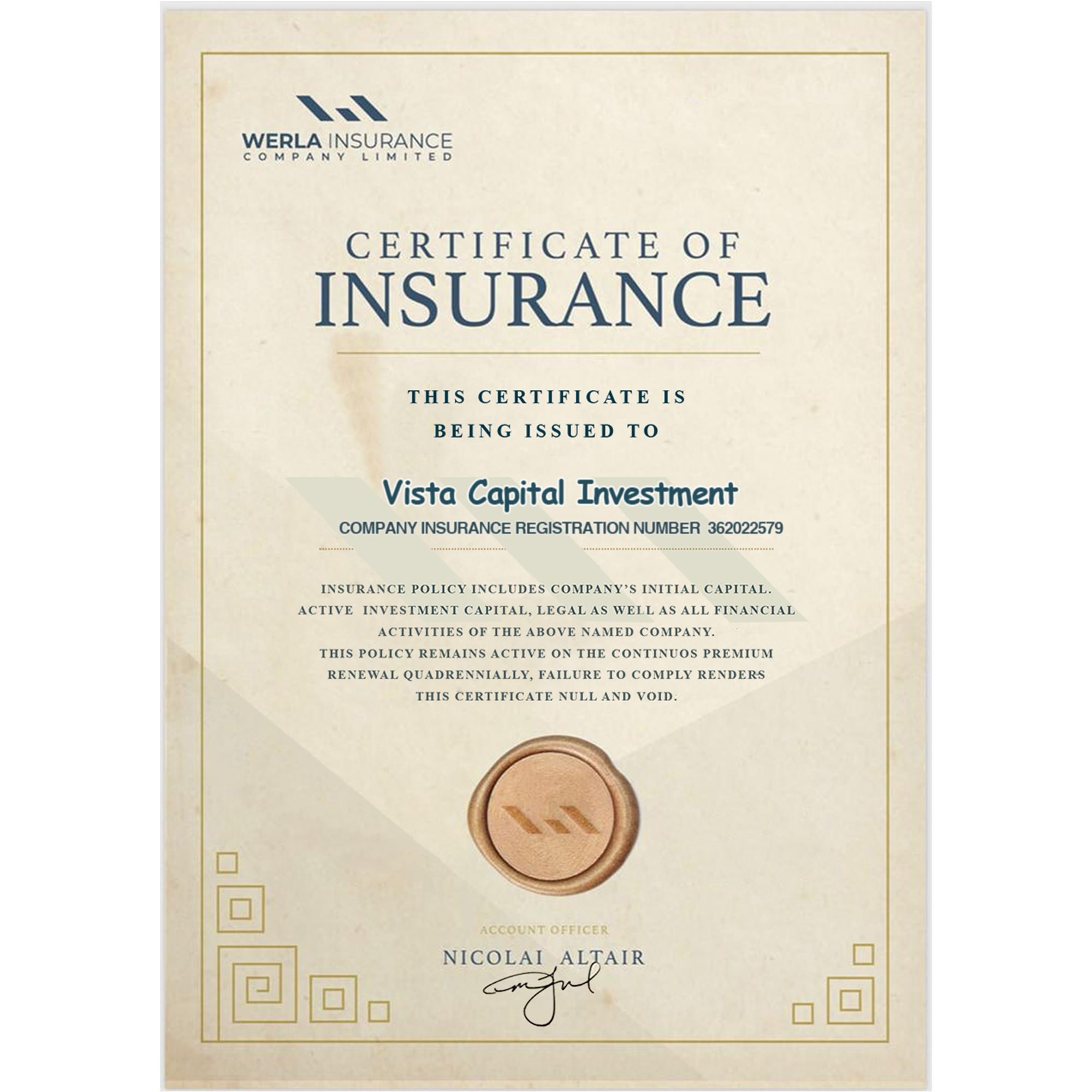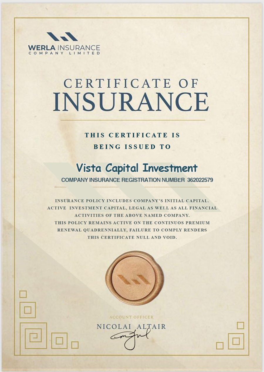 Vista Capital Invest have an Insurance Certificate, which makes it legal as well as financially active. By diversifying trading business lines and lowering overhead costs, vistacapital-inv.com can further increase competitive pressure in the investment market by consolidating online investment ideas with an ever-increasing number of investors and customers on completely legal grounds. View Certificate